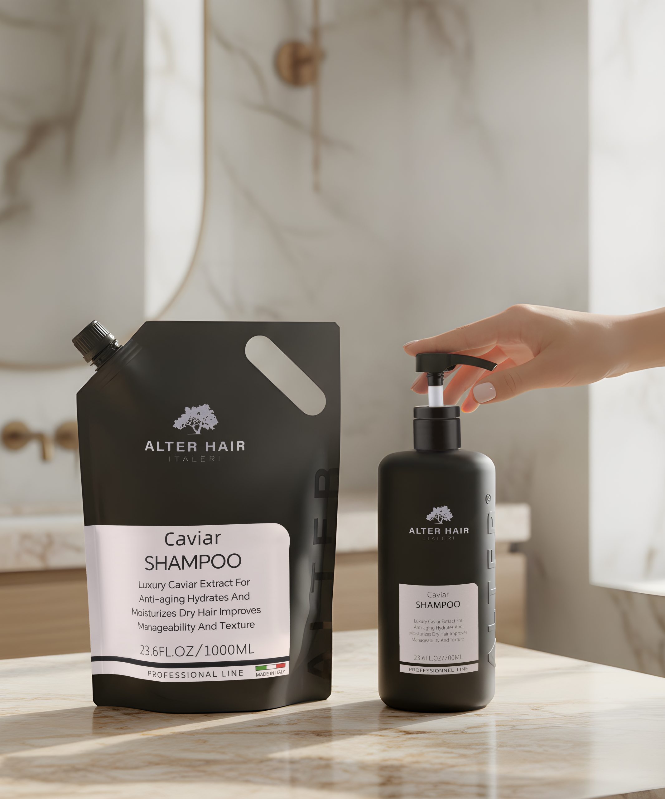 Indulge your hair in the rich nourishment of caviar extract with Alteritaleri’s premium shampoo. Our revolutionary 1000ml biodegradable sachet offers an eco-conscious luxury experience, delivering exceptional volume and shine while caring for the planet.